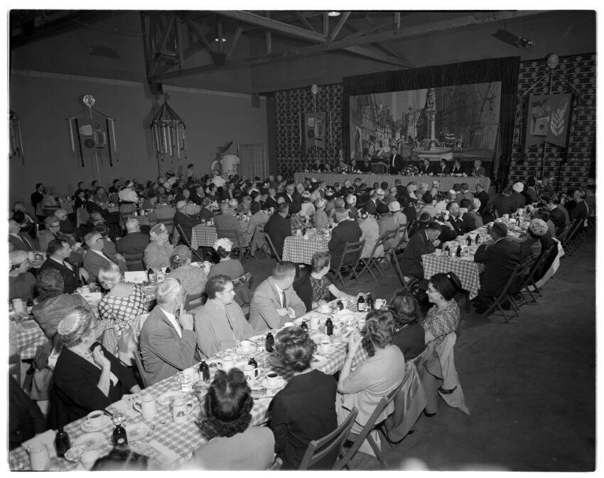 Negative, sheet film. 4 x 5 b&w. Olympia Brewing Co. stockholders party. No ID on people. New artwork of German street scene is unveiled.