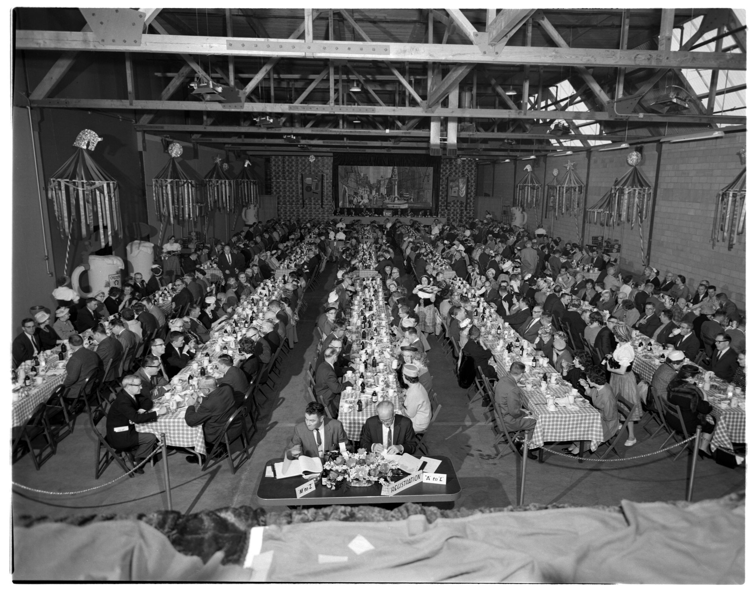 Negative, sheet film. 4 x 5 b&w. Olympia Brewing Co. stockholders party. No ID on people. Mural of German street scene on wall.