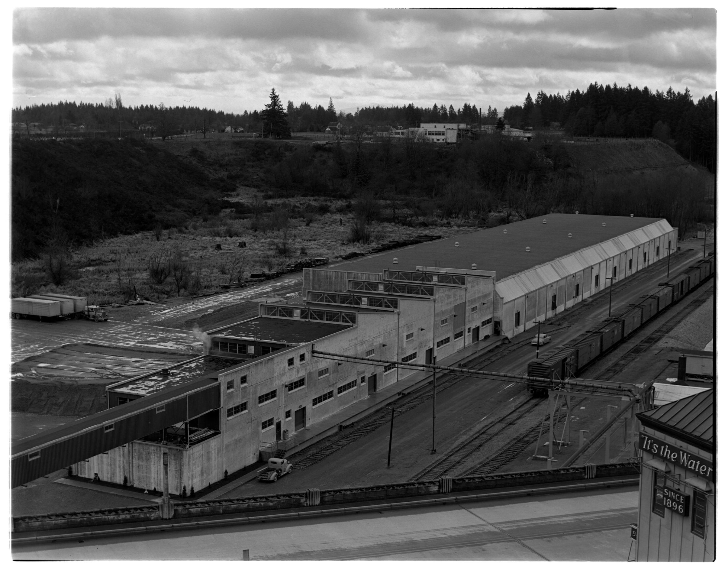 Negative, sheet film. 4 x 5 b&w. Olympia Brewing Co. Left half of building, with sawtooth roofline, is B bottlehouse. New warehouse on right was designed by Bob Wohleb. Chambers packing house visible in background. View looking southeast.Name/Title
