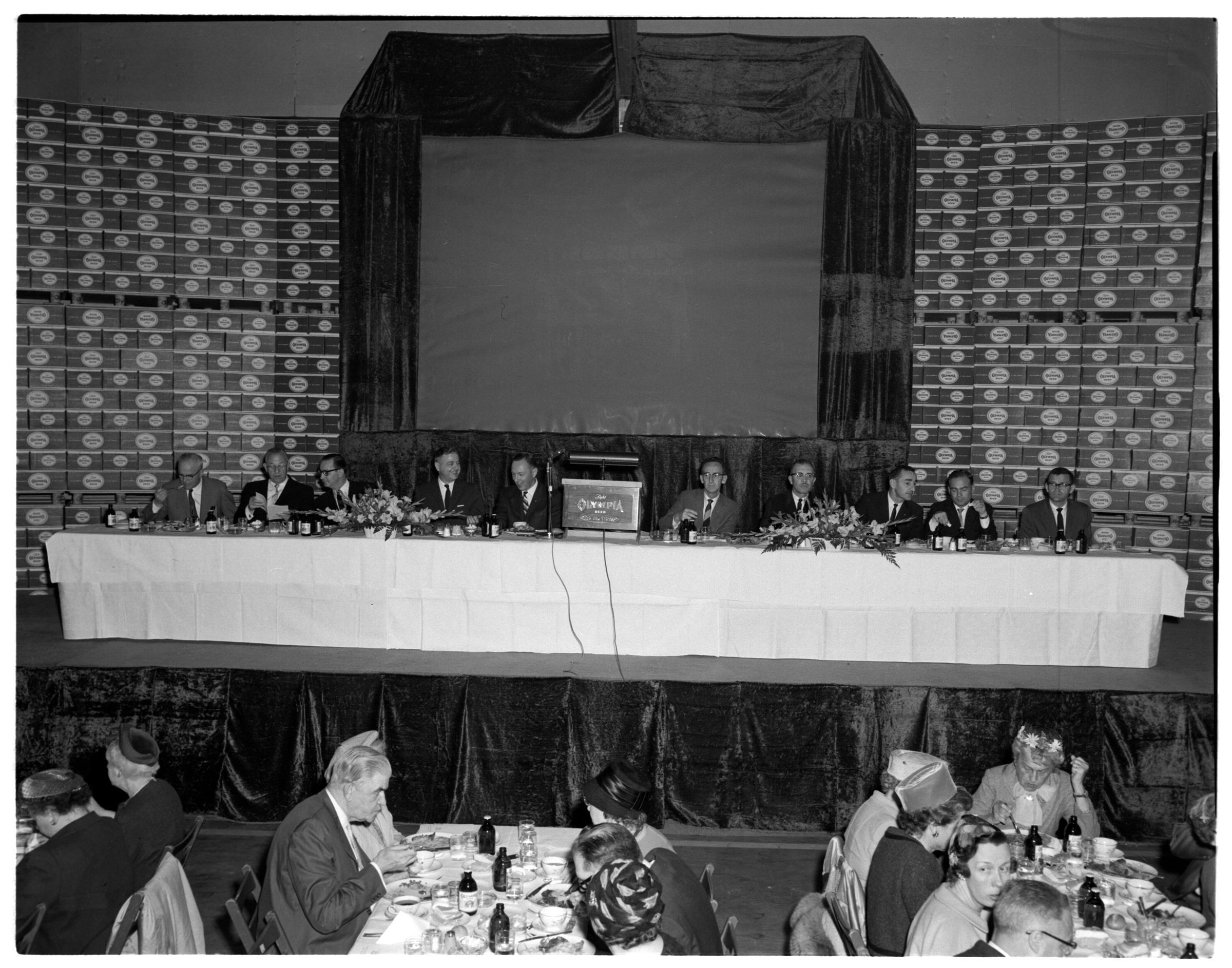 Negative, sheet film. 4 x 5 b&w. Olympia Brewing Co. stockholder luncheon. No ID on people.