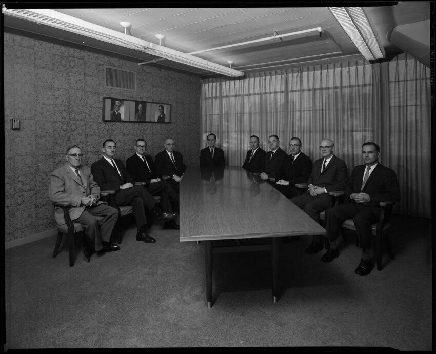 Negative, sheet film. 8 x 10 b&w. Olympia Brewing Co. Board of Directors. Left to right: Frederick W. Schmidt, Bink Schmidt, Bobby Schmidt, Arthur Halgren, Bump Schmidt, Sherman Huffine, Harry Henke, Thomas Morgan, Thomas O'Leary, Peter Schmidt Jr.