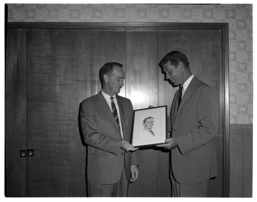 Negative, sheet film. 4 x 5 b&w. Olympia Brewing Co. Bob Sullivan presenting framed sketch to Bump Schmidt.