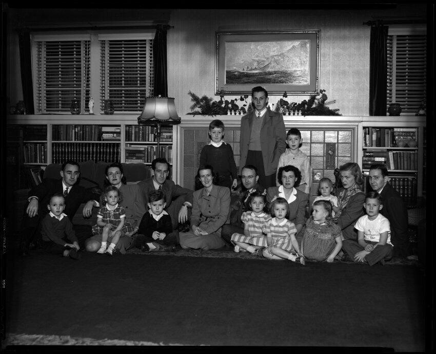 Negative, sheet film. 8 x 10 b&w. No. B954. Family photo at Winifred Schmidt's house. No ID on children. Row 1: Bink, Virginia, Bump, Waynette, Matt, Ky, Jeannette, Bobby Row 2: Skip