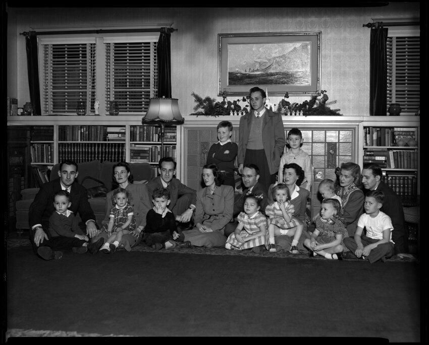 Negative, sheet film. 8 x 10 b&w. No. B954. Family photo at Winifred Schmidt's house. No ID on children. Row 1: Bink, Virginia, Bump, Waynette, Matt, Ky, Jeannette, Bobby Row 2: Skip