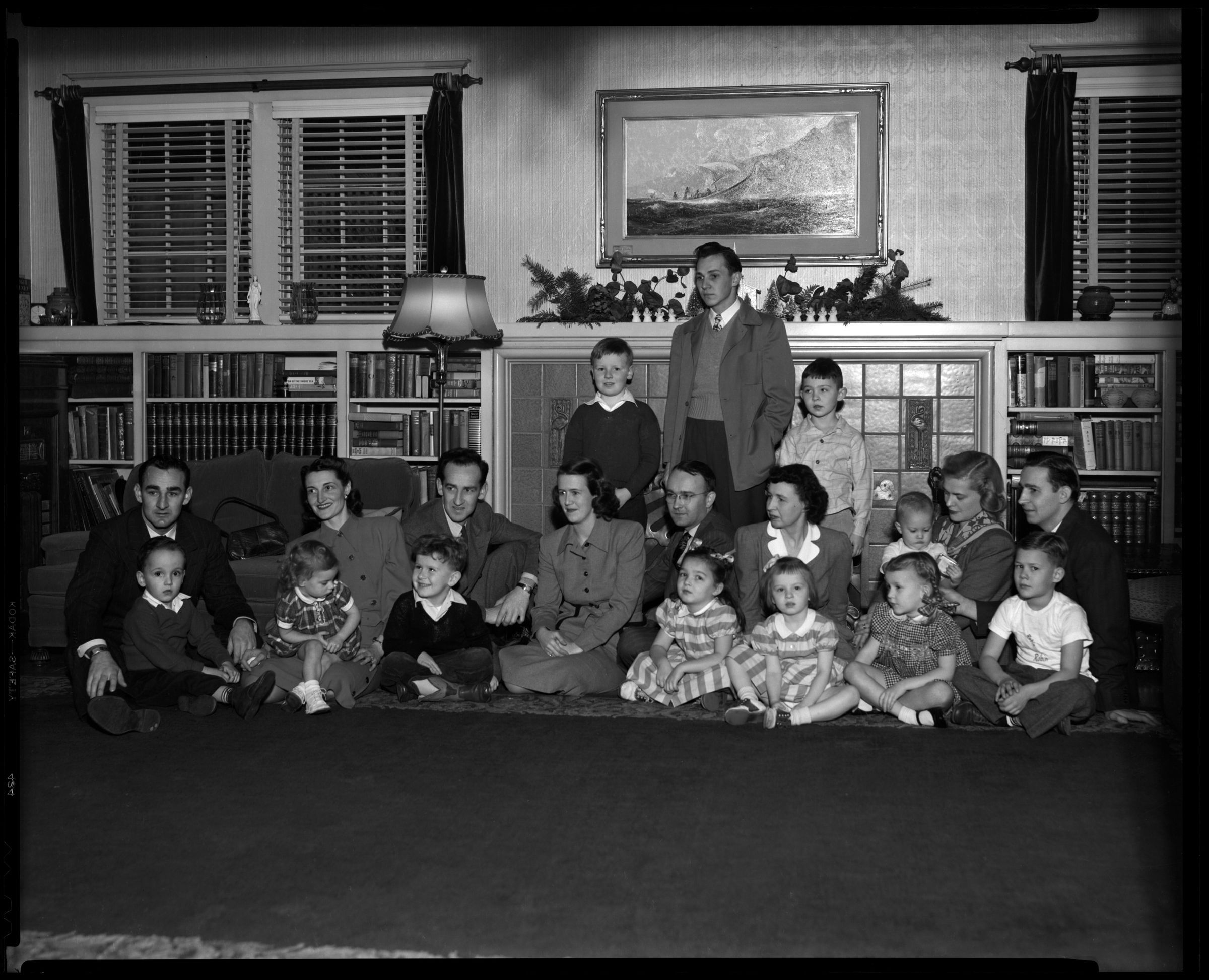 Negative, sheet film. 8 x 10 b&w. No. B954. Family photo at Winifred Schmidt's house. No ID on children. Row 1: Bink, Virginia, Bump, Waynette, Matt, Ky, Jeannette, Bobby Row 2: Skip