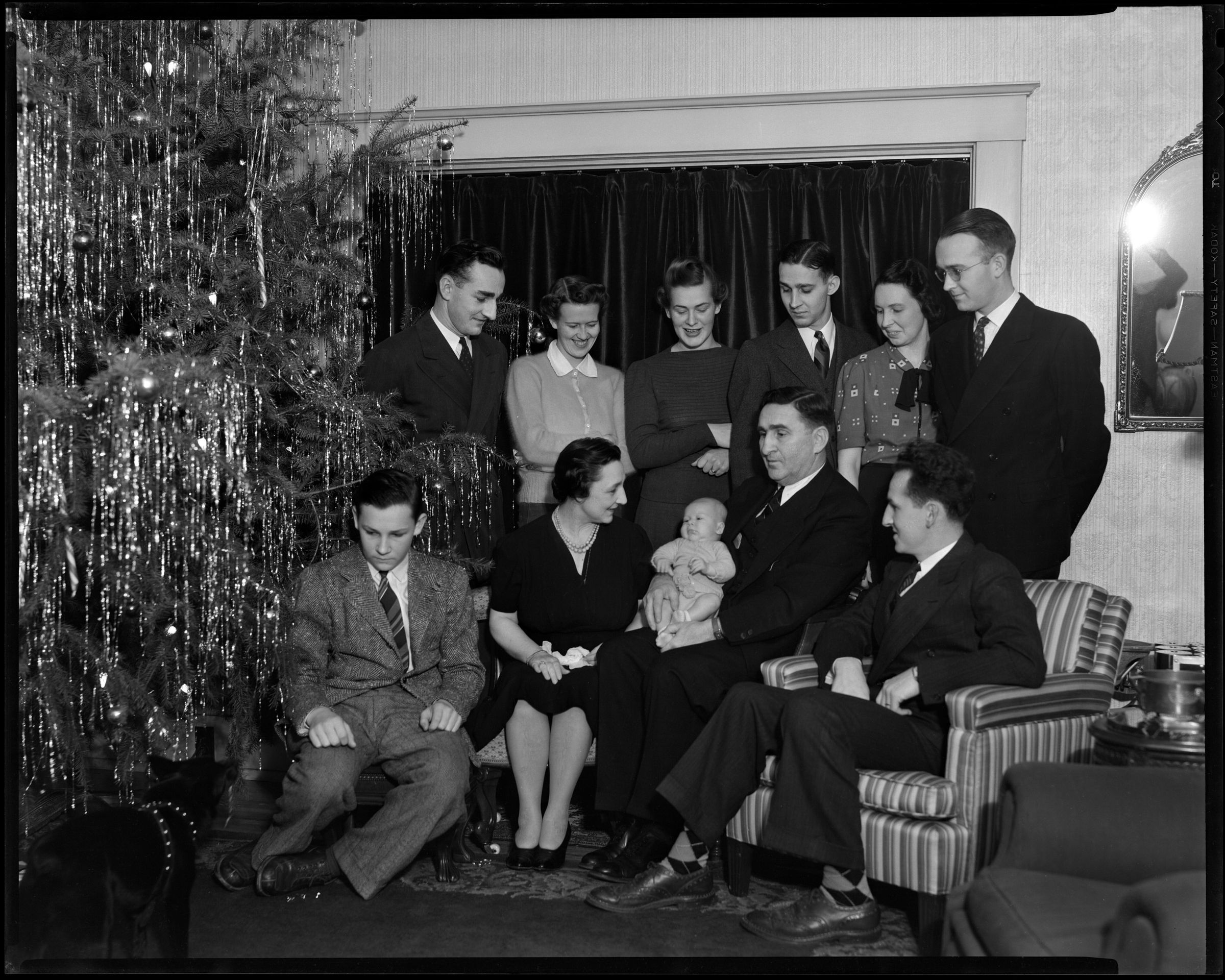Negative, sheet film. 8 x 10 b&w. No. 5121. Family photo at Winifred Schmidt's house. Row 1: Skip, Winifred, baby Robbie, Adolph, Bump Row 2: Bink, Waynette, Virginia, Bobby, Ky, Matt