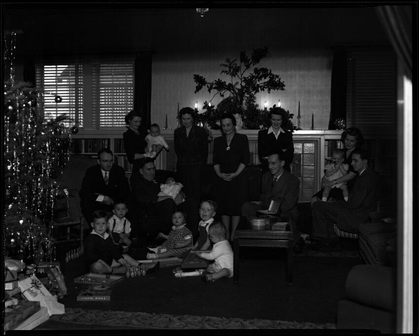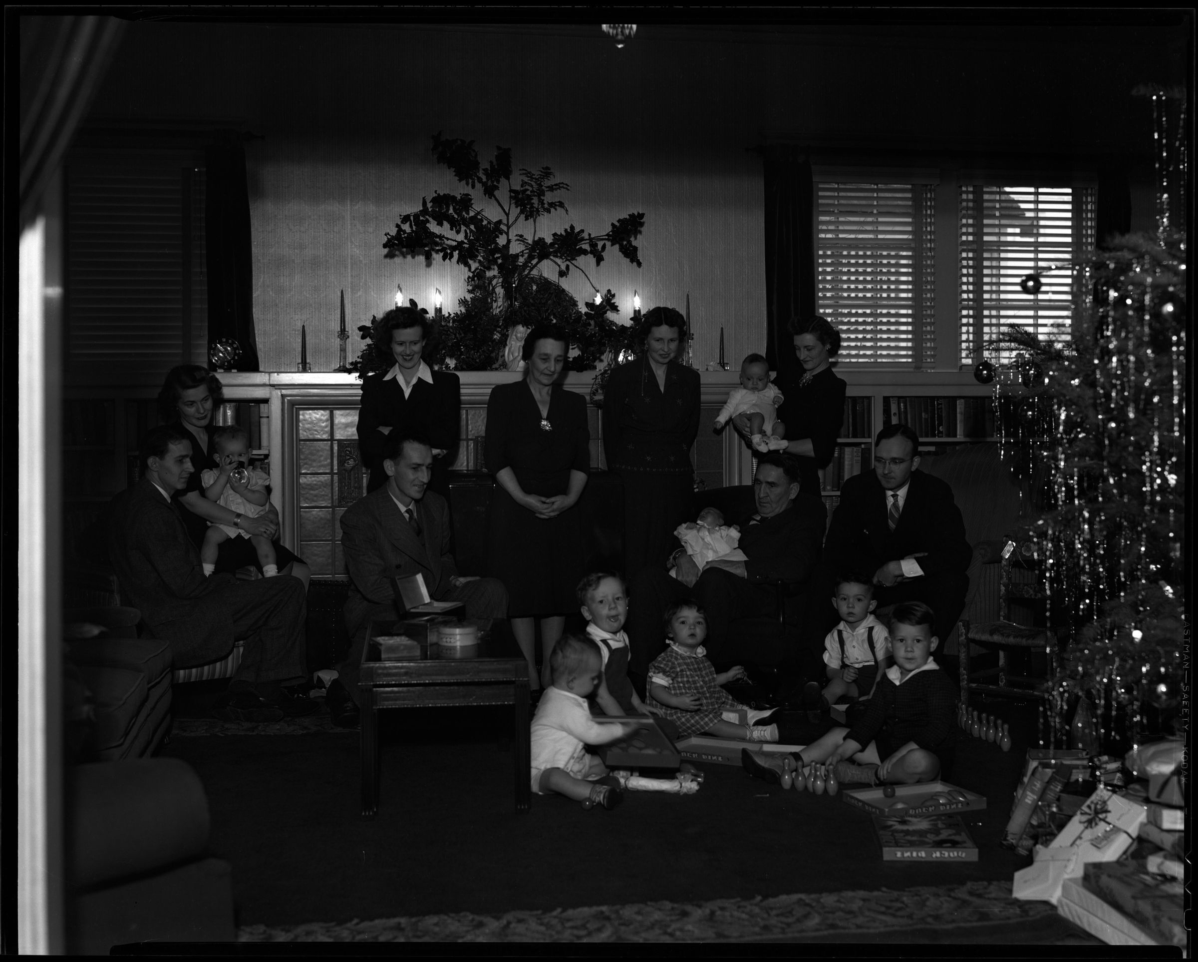Negative, sheet film. 8 x 10 b&w. No. 11010. Family photo at Winifred Schmidt's house. No ID on children. Row 1: Matt, Adolph, Bump, Jeannette, Bobby Row 2: Virginia, Ky, Winifred, Waynette