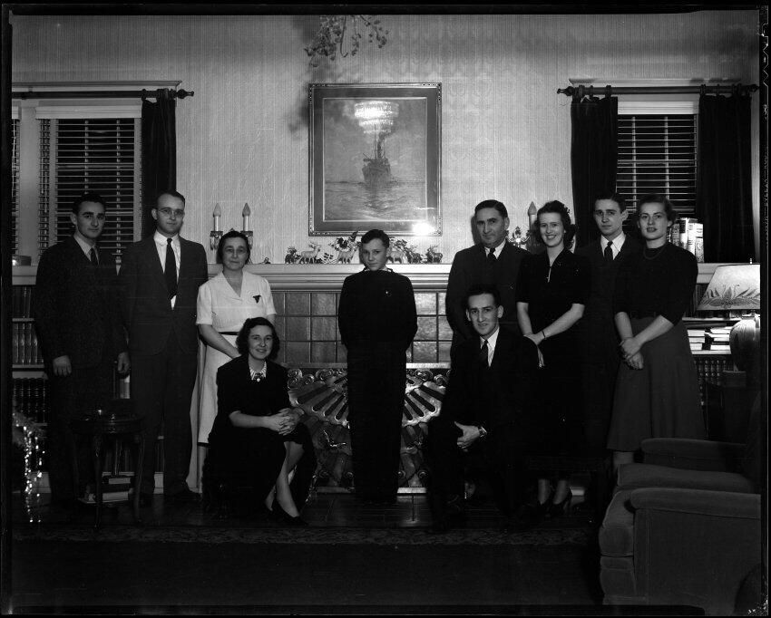 Negative, sheet film. 8 x 10 b&w. No. 4283. Family photo at Winifred Schmidt's house. Bink, Matt, Winifred, Ky, Skip, Bump, Adolph, Waynette, Bobby, Jeannette
