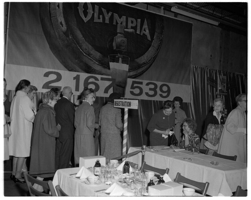 Negative, sheet film. 4 x 5 b&w. Olympia Brewing Co. stockholders luncheon. No ID on people.