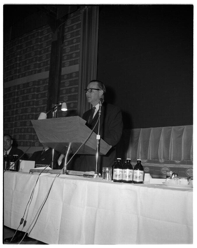 Negative, sheet film. 5 x 4 b&w. Olympia Brewing Co. stockholders luncheon. Bobby Schmidt at podium.