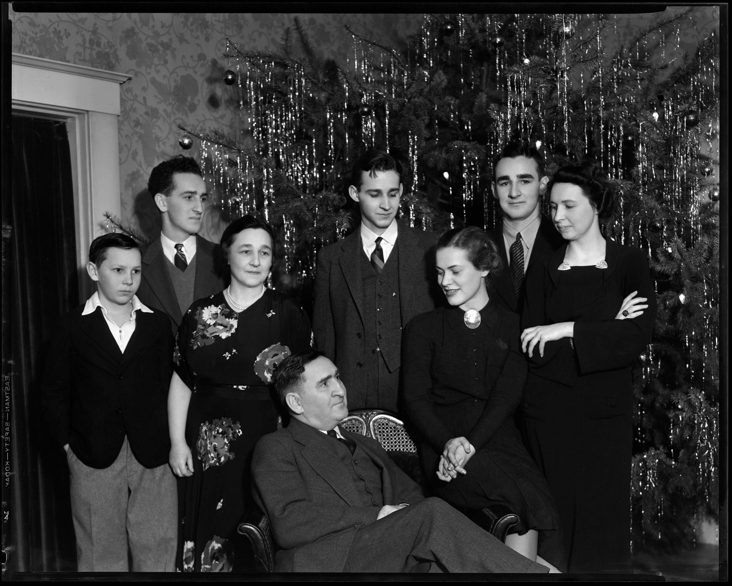 Negative, sheet film. 8 x 10 b&w. No. 3441. Family photo at Winifred Schmidt's house. Left to right: Skip, Bump, Winifred, Adolph, Bobby, Jeannette, Bink, Ky.