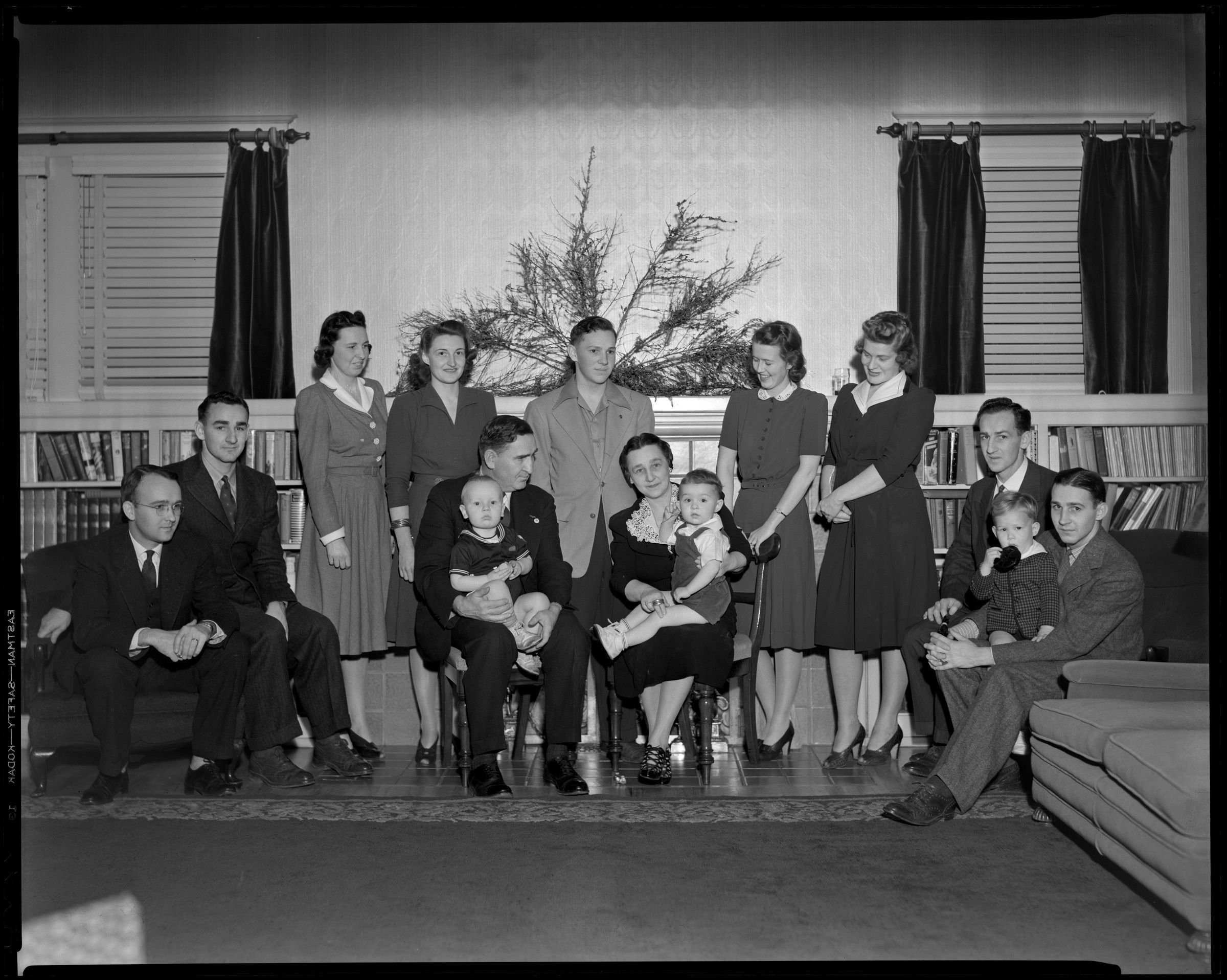 Negative, sheet film. 8 x 10 b&w. No. 7363. Family photo at Winifred Schmidt's house. Left to right: Matt, Bink, Ky, Virginia, Adolph, Skip, Winifred, Waynette, Jeannette, Bump, Bobby. No ID on children.Name/Title