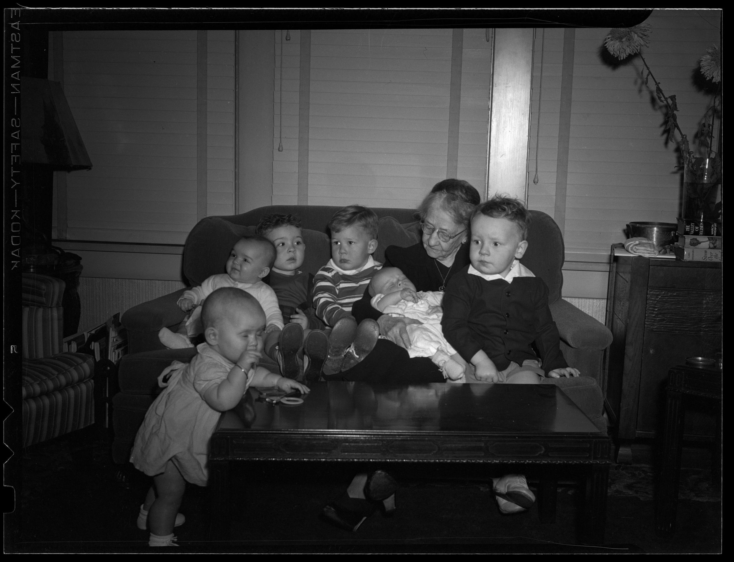 Negative, sheet film. 3 x 4 b&w. No. 9606. Adolph Schmidt. Christmas group. Reordered Feb 10 Wed. No ID on people.