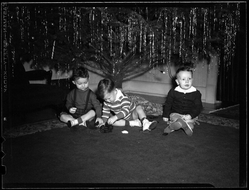 Negative, sheet film. 3 x 4 b&w. No. 9606. Adolph Schmidt. Christmas group. Reordered Feb 10 Wed. Grandchildren of Adolph and Winifred Schmidt. No ID on people.