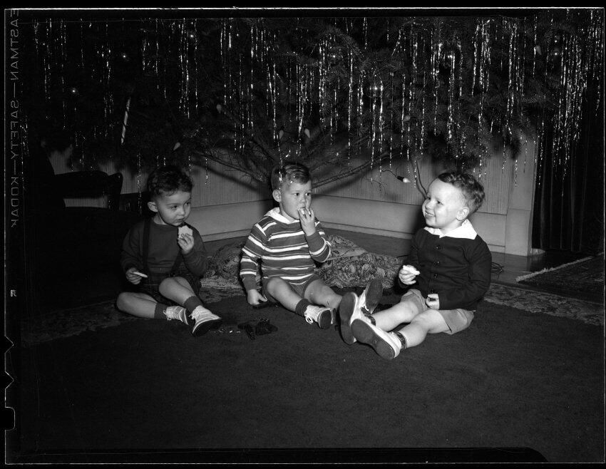 Negative, sheet film. 3 x 4 b&w. No. 9606. Adolph Schmidt. Christmas group. Reordered Feb 10 Wed. Grandchildren of Adolph and Winifred Schmidt. No ID on people.