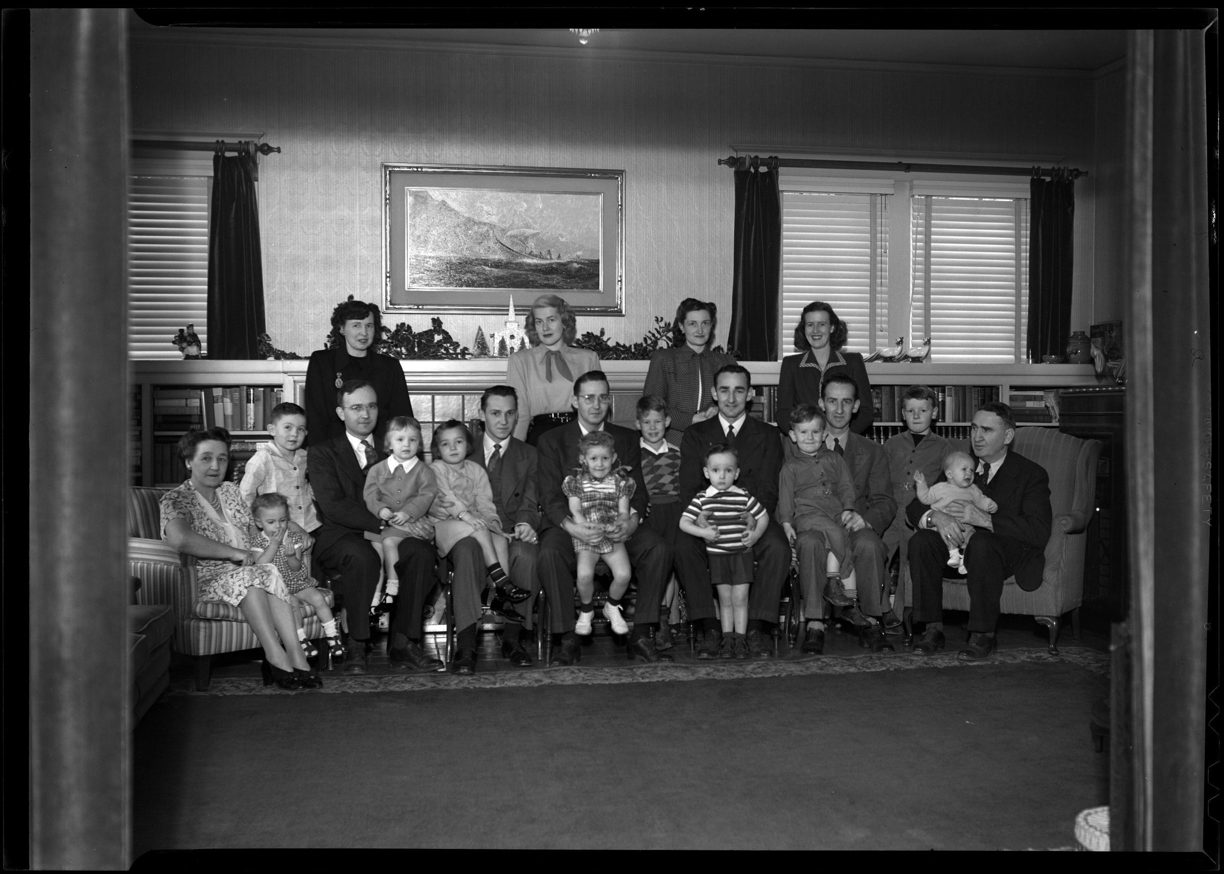 Negative, sheet film. 5 x 7 b&w. No. A1090. Family at Winifred Schmidt's home. No ID on children. Row 1: Winifred, Matt, Skip, Bobby, Bink, Bump, Adolph Row 2: Ky, Jeannette, Virginia, Waynette