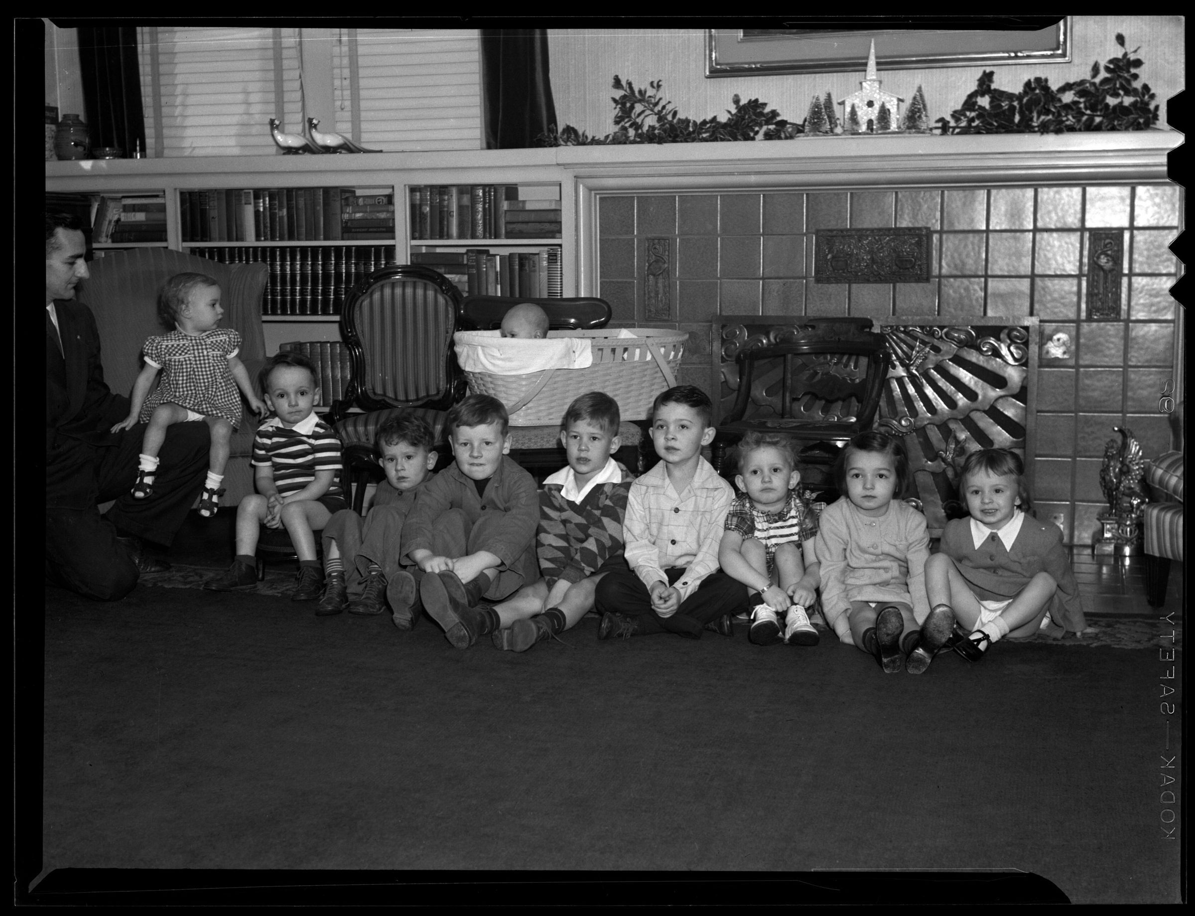 Negative, sheet film. 3 x 4 b&w. No. A1090. Family photo at Winifred Schmidt's house. Bink Schmidt at left. No ID on children (all grandchildren of Adolph and Winifred).