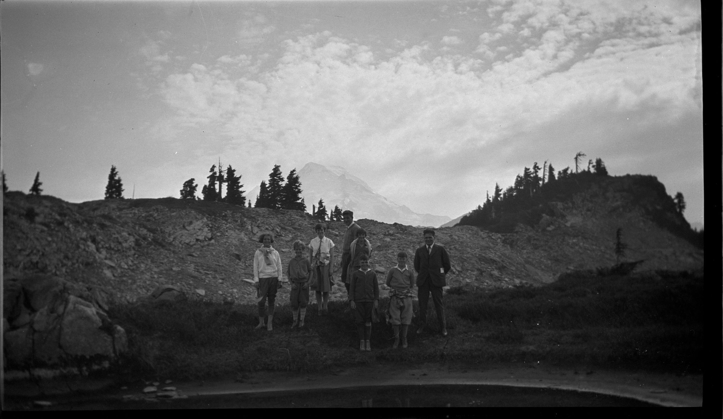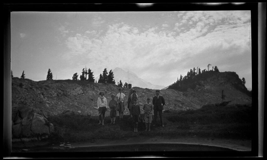 Negative, sheet film. 3 x 5 b&w. Group of Schmidt family members and friends (no ID) at Mt. Baker, WA.