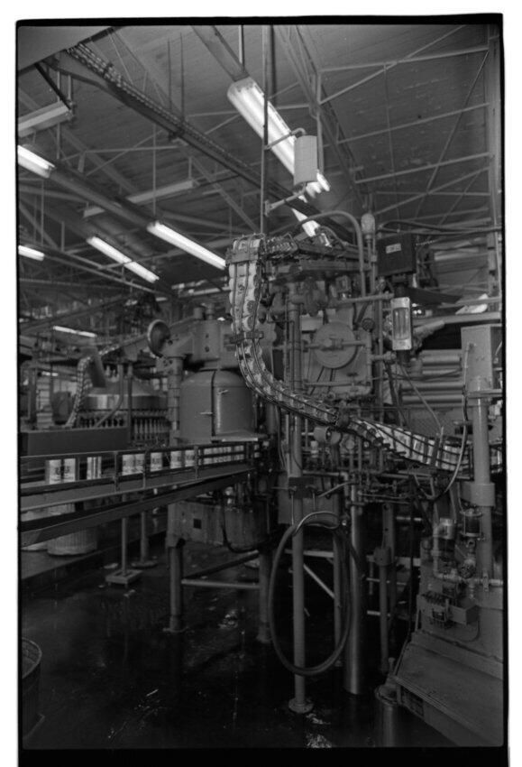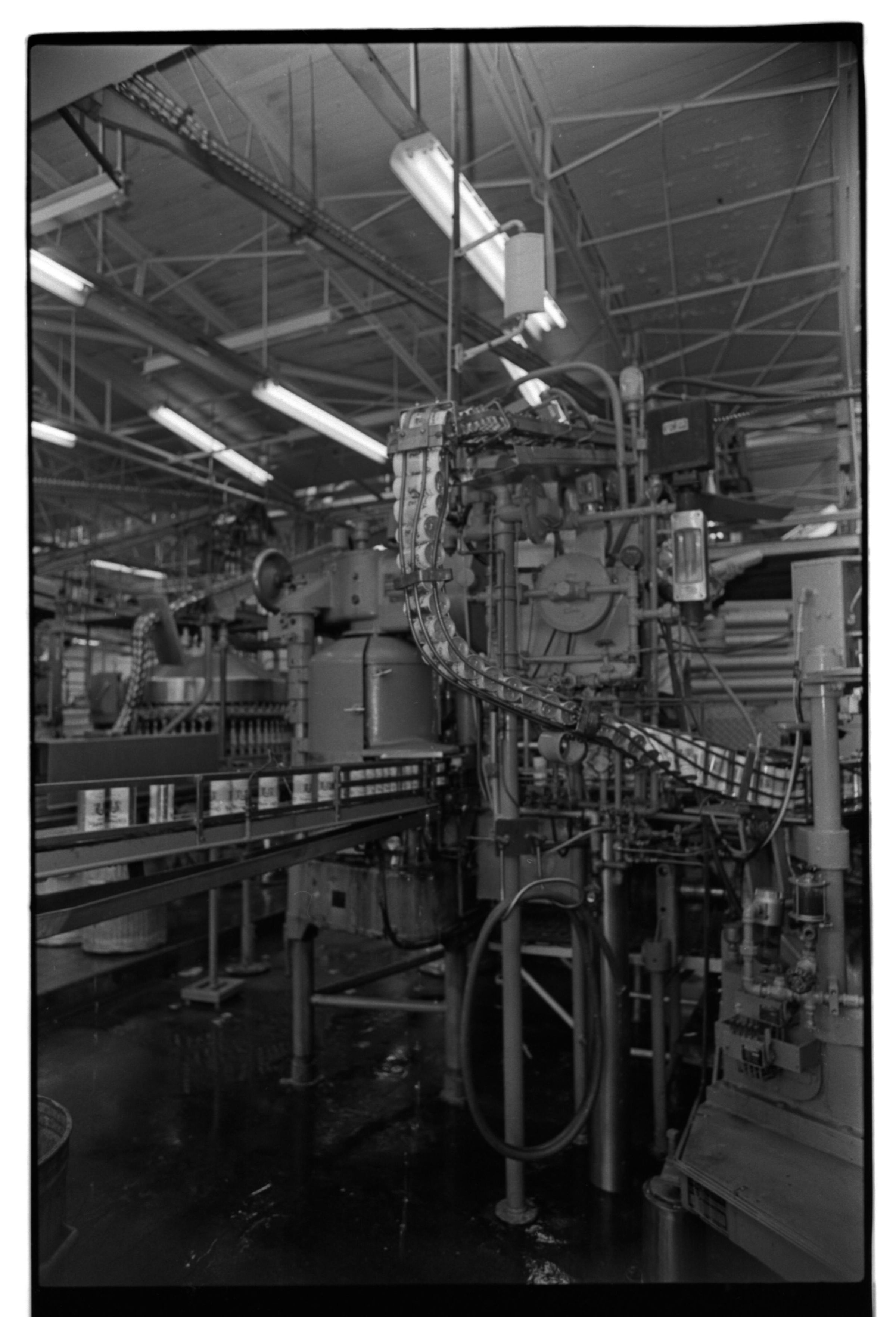 Negative, sheet film. 1.5 x 1 b&w. Cans on conveyor belt in packaging department.