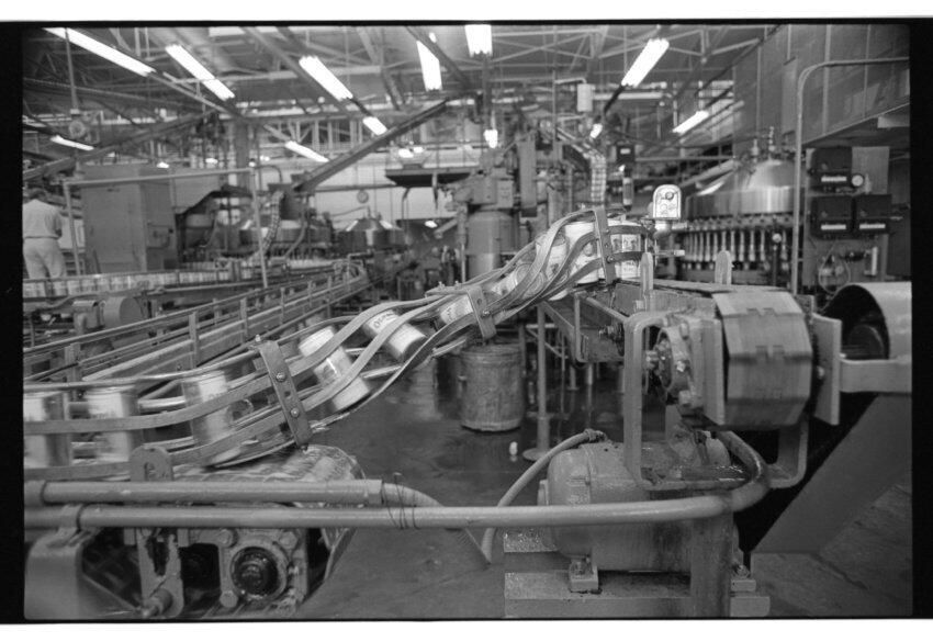 Negative, sheet film. 1 x 1.5 b&w. Cans on conveyor belt in packaging department.