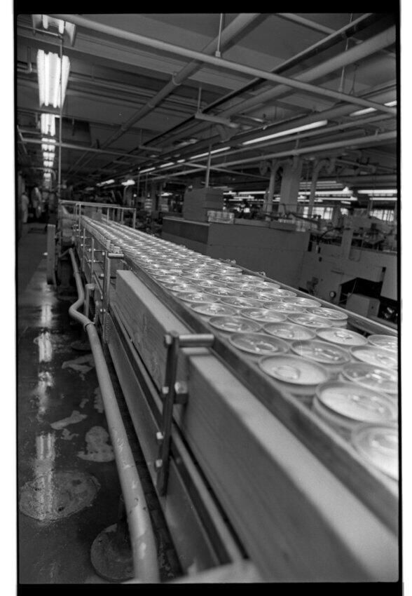 Negative, sheet film. 1.5 x 1 b&w. Beer cans just prior to or just after having 6-pack rings installed.