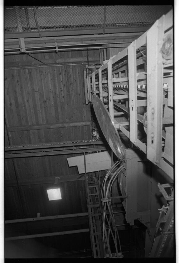 Negative, sheet film. 1.5 x 1 b&w. Beer cans on conveyor belt.