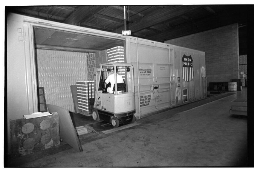 Negative, sheet film. 1 x 1.5 b&w. Forklift loading beer on to Union Pacific railcar.
