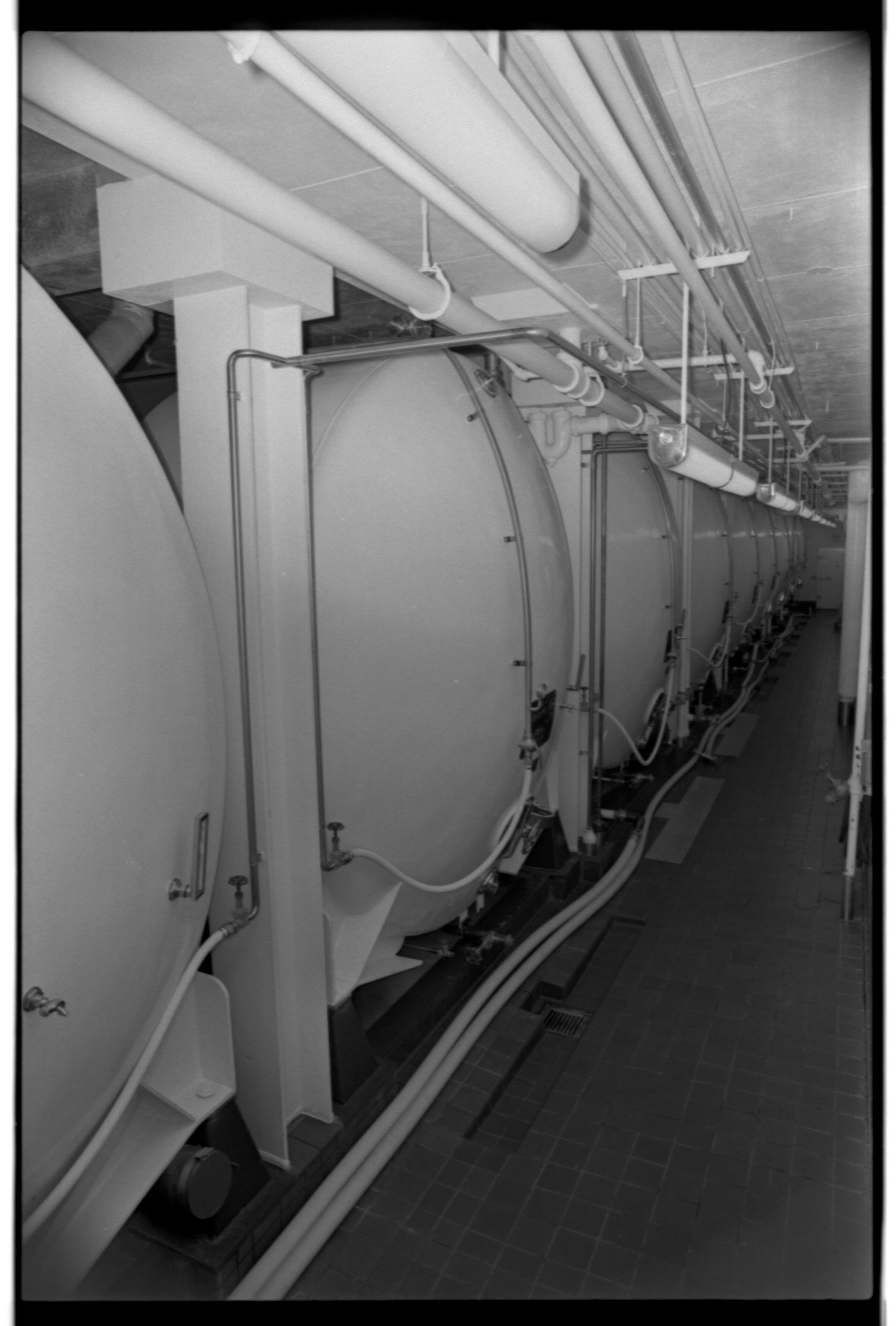 Negative, sheet film. 1.5 x 1 b&w. Cellar scene showing finished beer tanks.