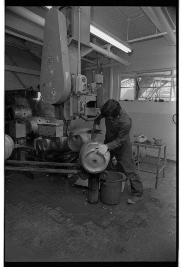 Negative, sheet film. 1.5 x 1 b&w. Unidentified brewery worker with aluminum keg.