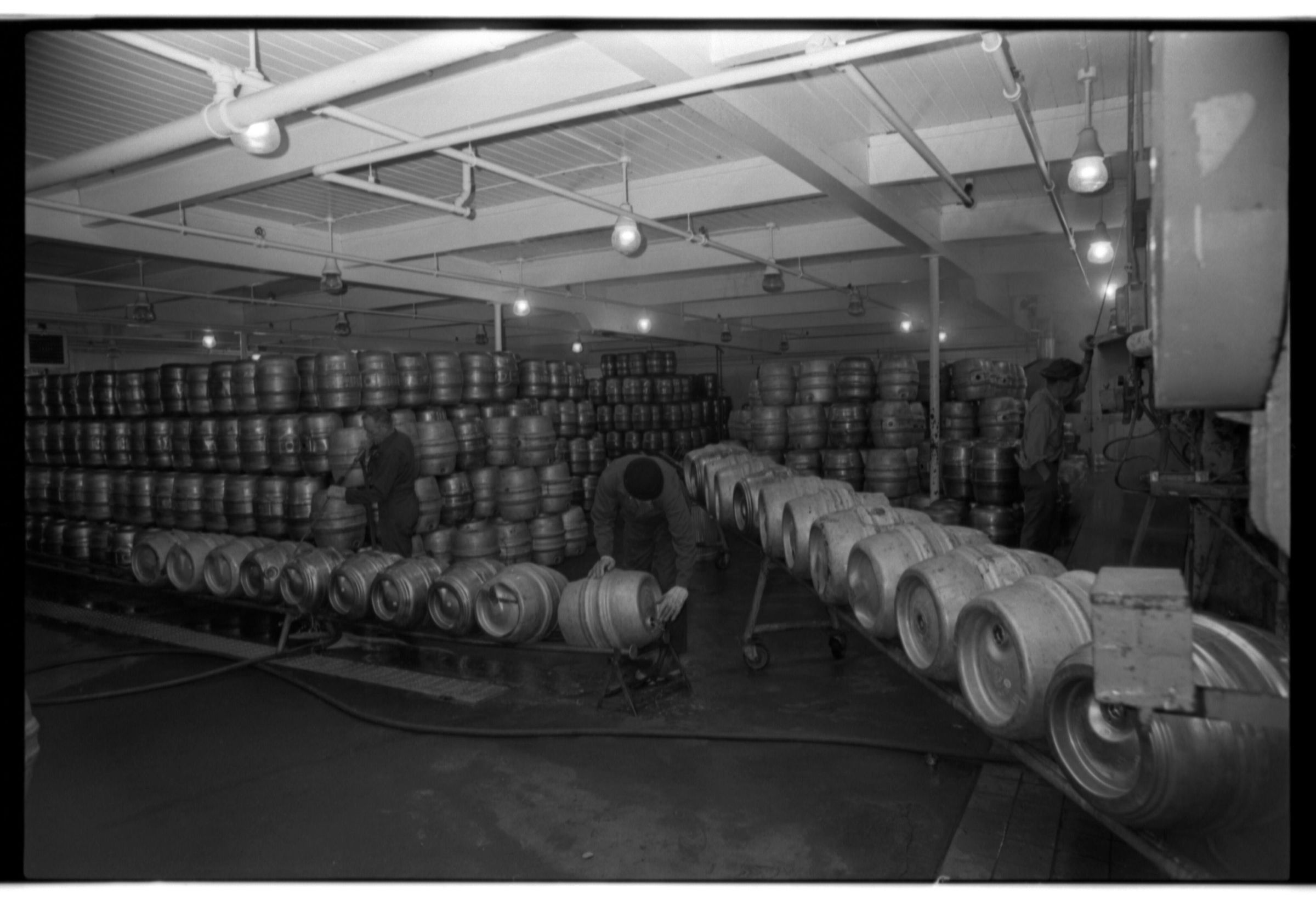 Negative, sheet film. 1 x 1.5 b&w. Aluminum kegs used exclusively for Hamm's beer.