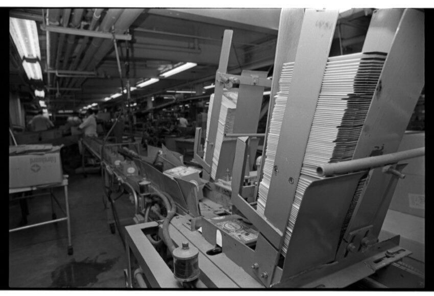 Negative, sheet film. 1 x 1.5 b&w. Making cardboard boxes.