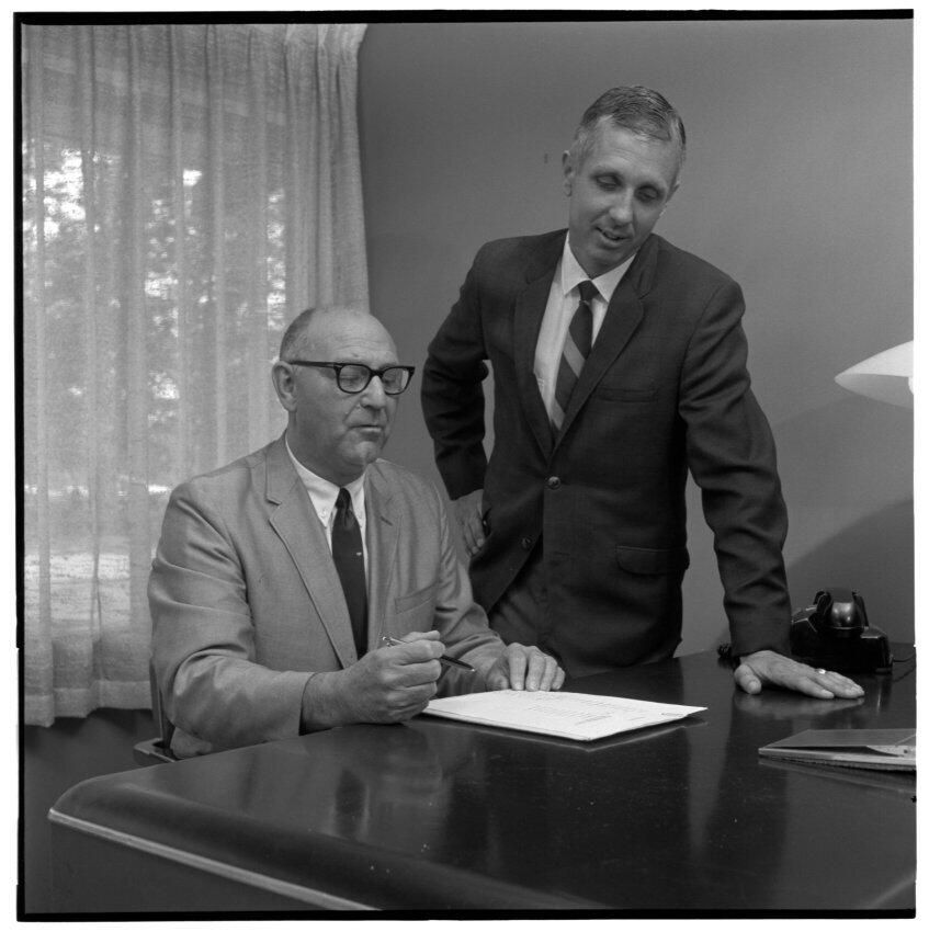 Negative, sheet film. 2.25 x 2.25 b&w. Carl Reder seated, no ID on other.