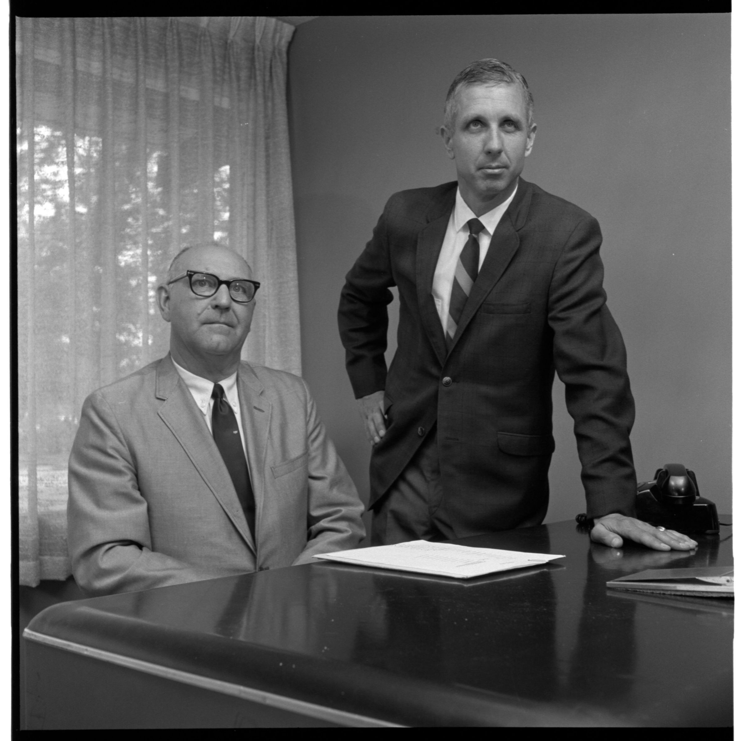 Negative, sheet film. 2.25 x 2.25 b&w. Carl Reder seated, no ID on other.
