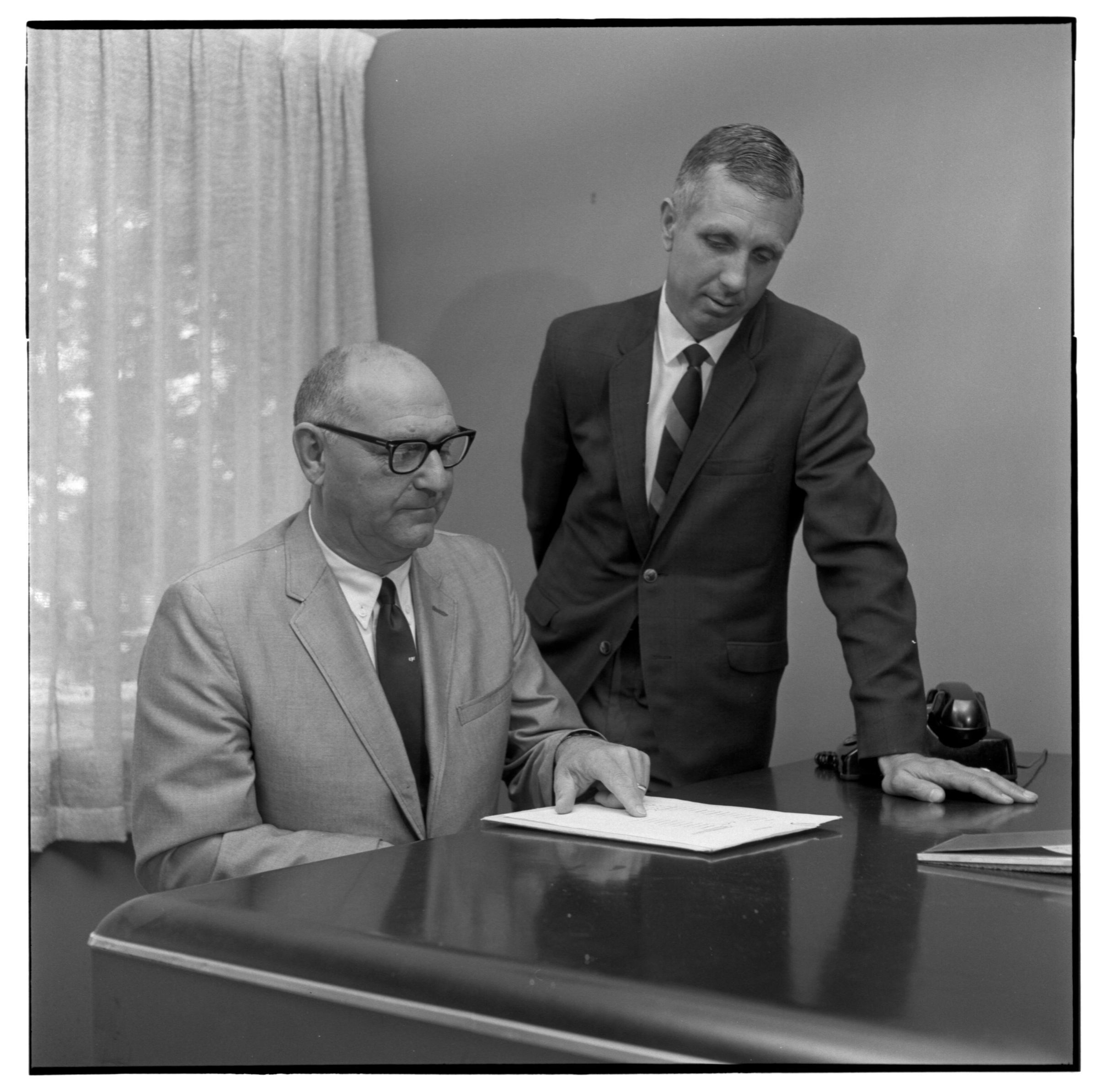 Negative, sheet film. 2.25 x 2.25 b&w. Carl Reder seated, no ID on other.