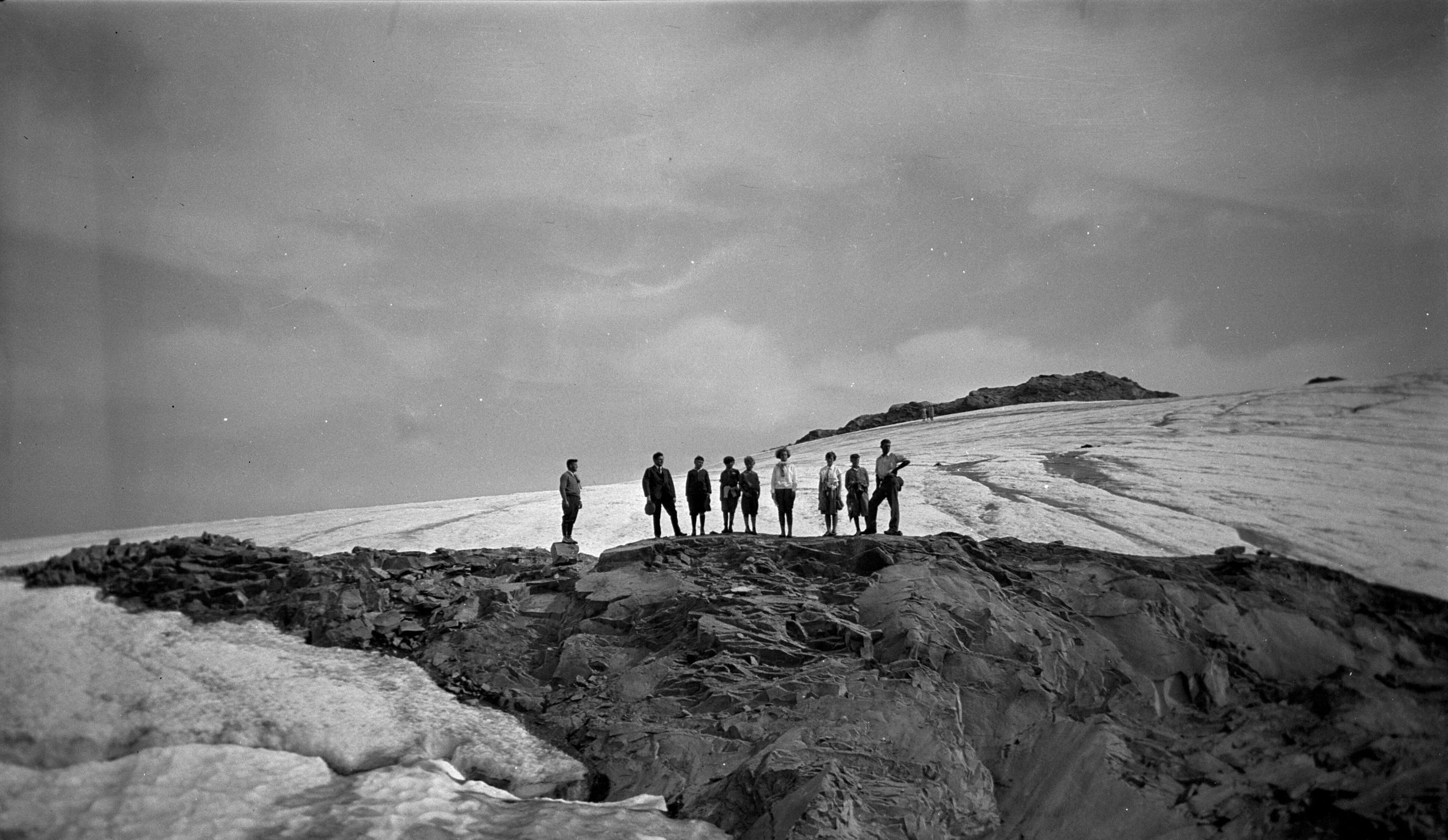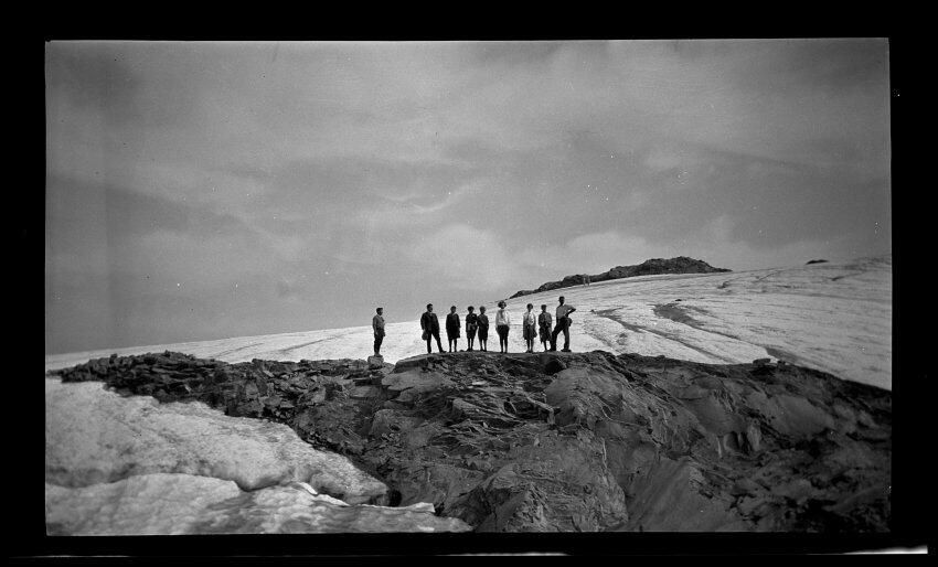 Negative, sheet film. 3 x 5 b&w. Schmidt family and friends on rock outcropping near Mt. Baker