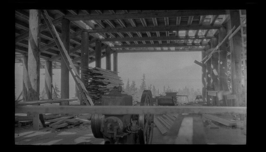 Negative, sheet film. 3 x 5 b&w. Construction of lodge at Mt. Baker