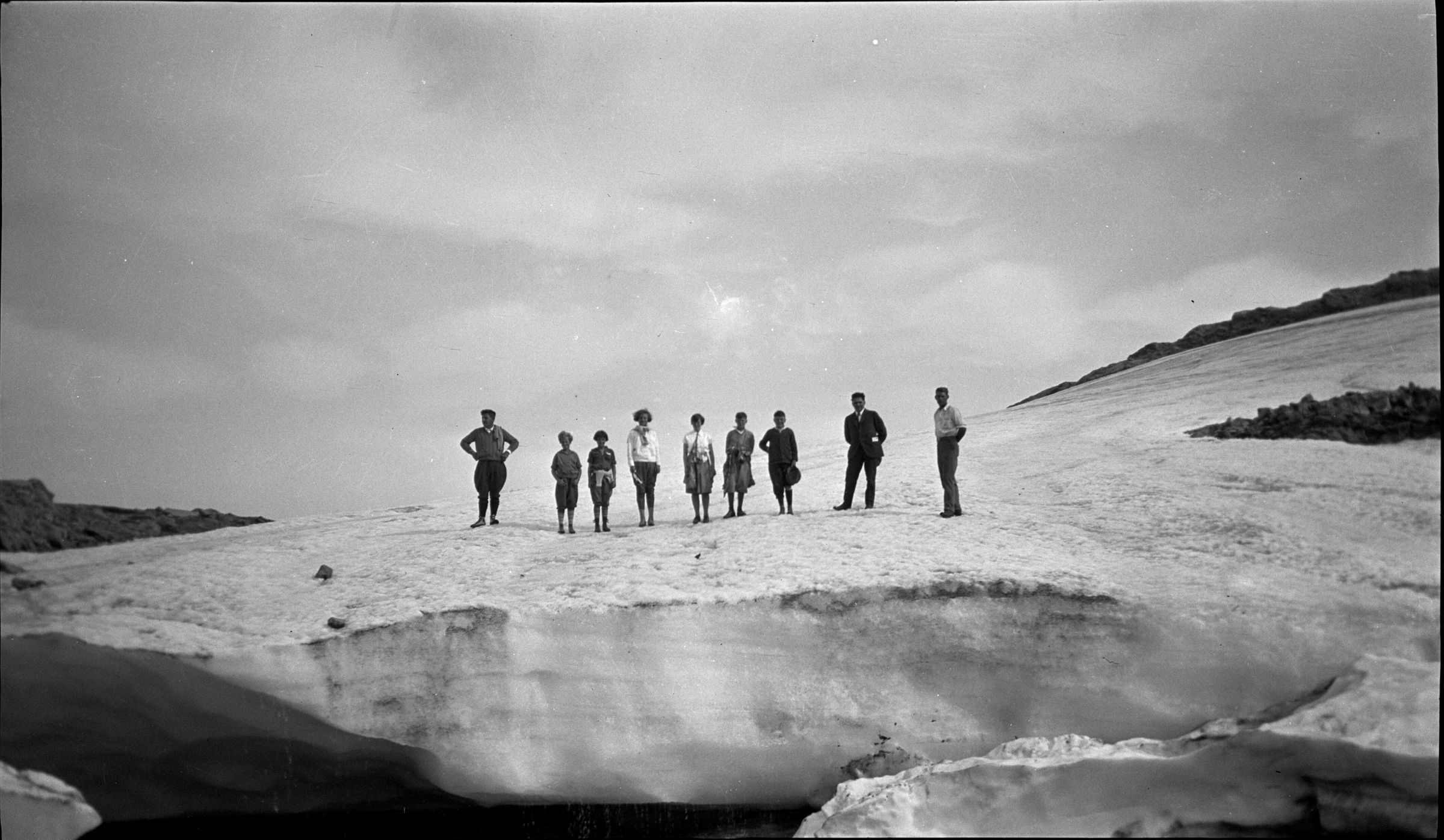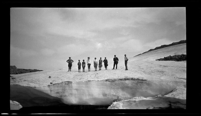 Negative, sheet film. 3 x 5 b&w. Schmidt family and friends on snowfield near Mt. Baker. Peter G. Schmidt Sr. at right.