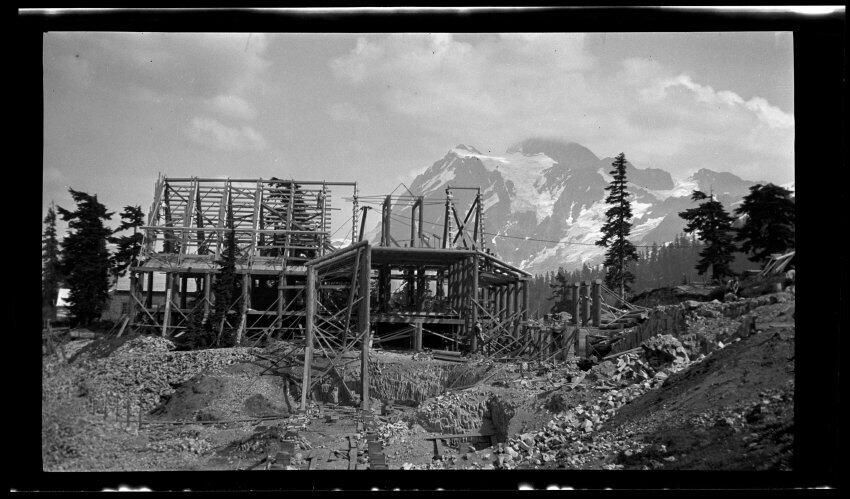 Negative, sheet film. 3 x 5 b&w. Construction of lodge at Mt. Baker