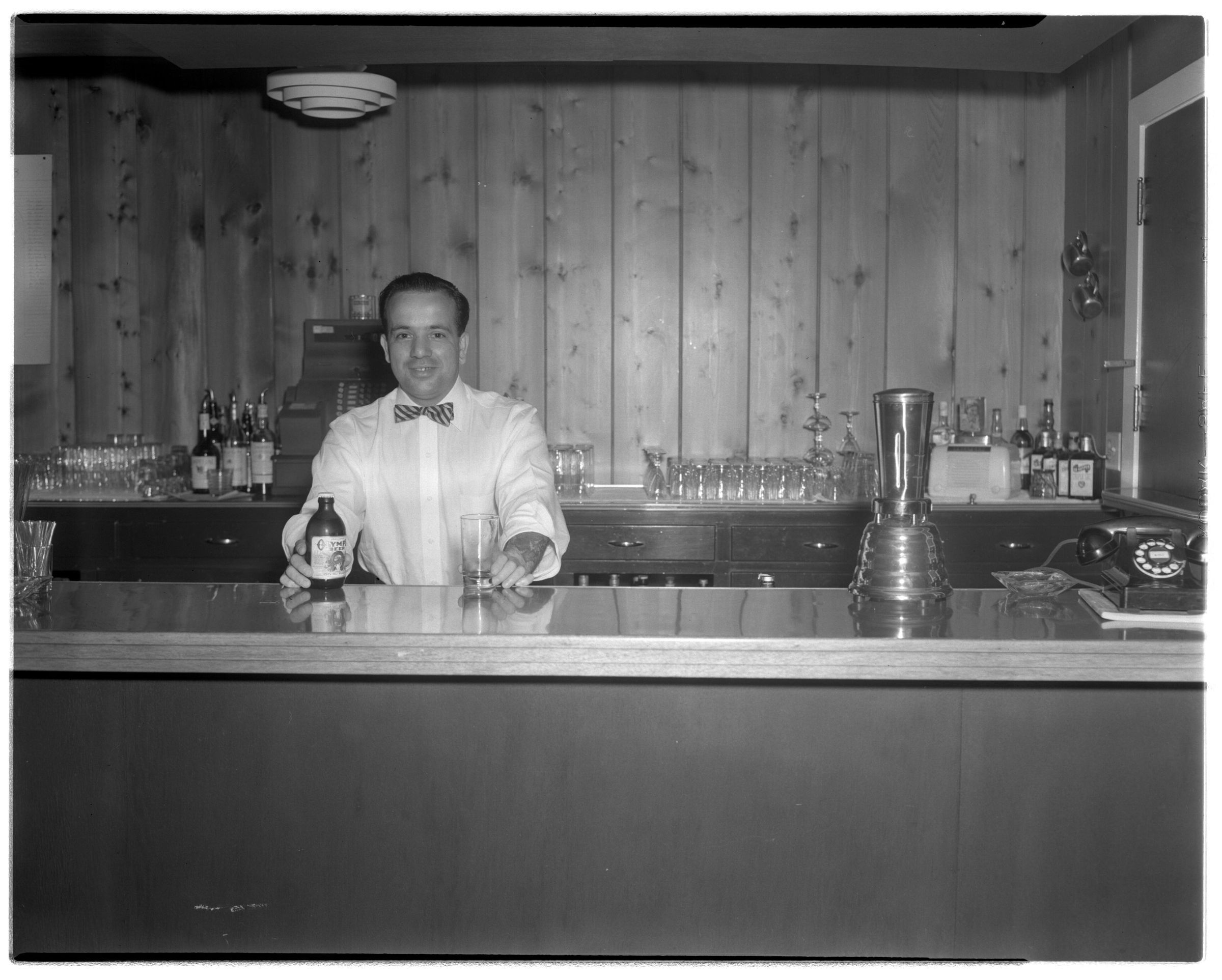 Negative, sheet film. 4 x 5 b&w. No. 148. Bartender, OC&GC (Jerry).