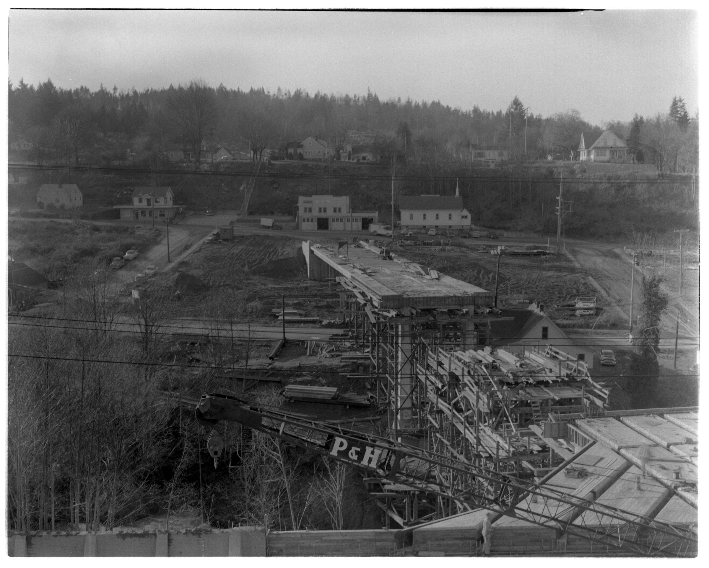 Negative, sheet film. 4 x 5 b&w. No. 322. Custer Way Bridge being built. Looking west to Tumwater Hill.