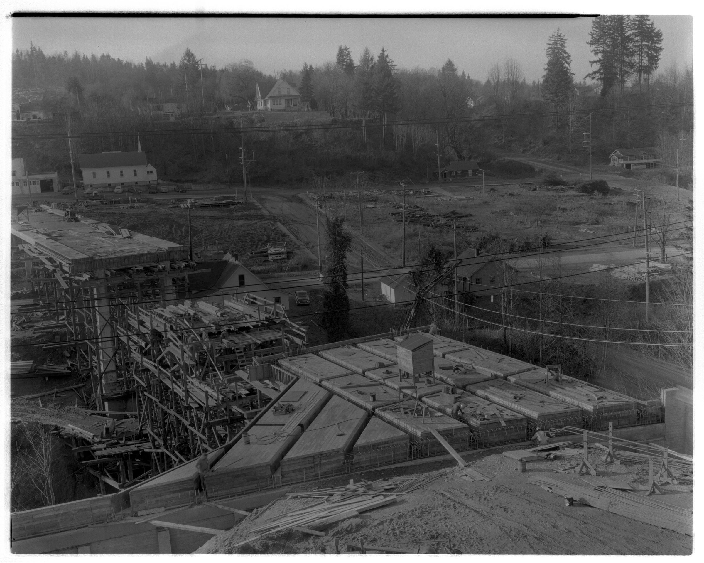 Negative, sheet film. 4 x 5 b&w. No. 322. Custer Way Bridge being built. Looking west to Tumwater Hill.