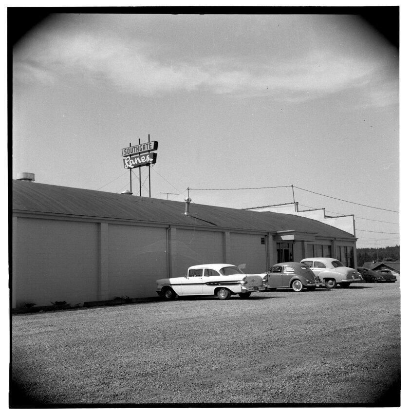 Negative, sheet film. 2.25 x 2.25 b&w. Southgate Lanes in Southgate Shopping Center, Tumwater.