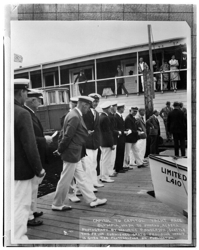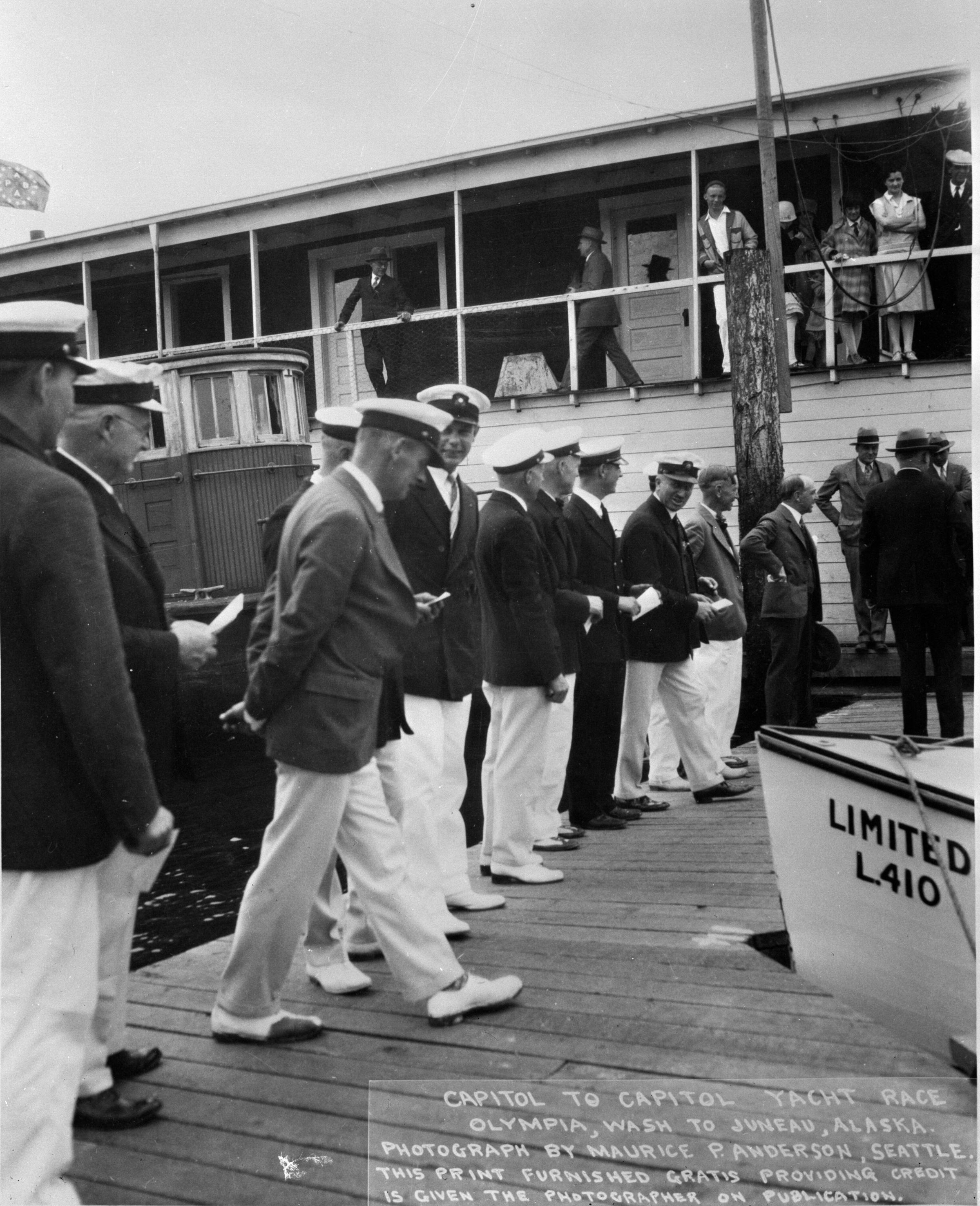 Negative, sheet film. 4 x 5 b&w. First Capital to Capital motor yacht race between Olympia WA and Juneau AK. Race contestants at dock in Juneau. Photograph by Maurice P. Anderson.