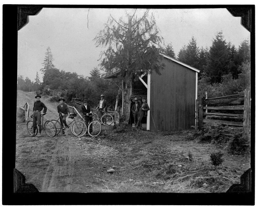 Negative, sheet film. 4 x 5 b&w. Members of bicycle club stop at a shelter advertising local businesses. Unknown location within Thurston County. No ID on men.