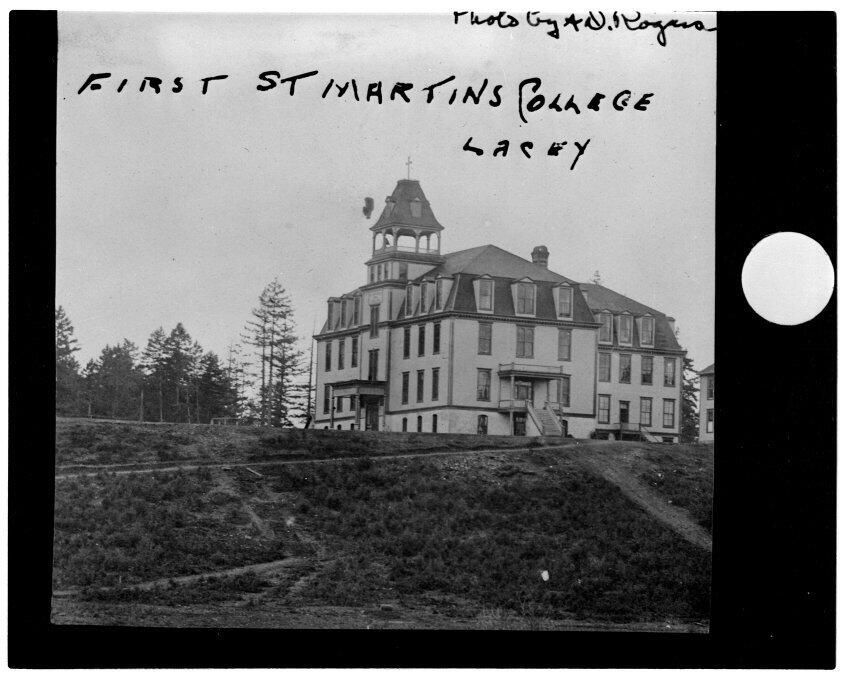 Negative, sheet film. 4 x 5 b&w. Original wood administration building at Saint Martin's College, Lacey WA. Photo by A. D. Rogers.