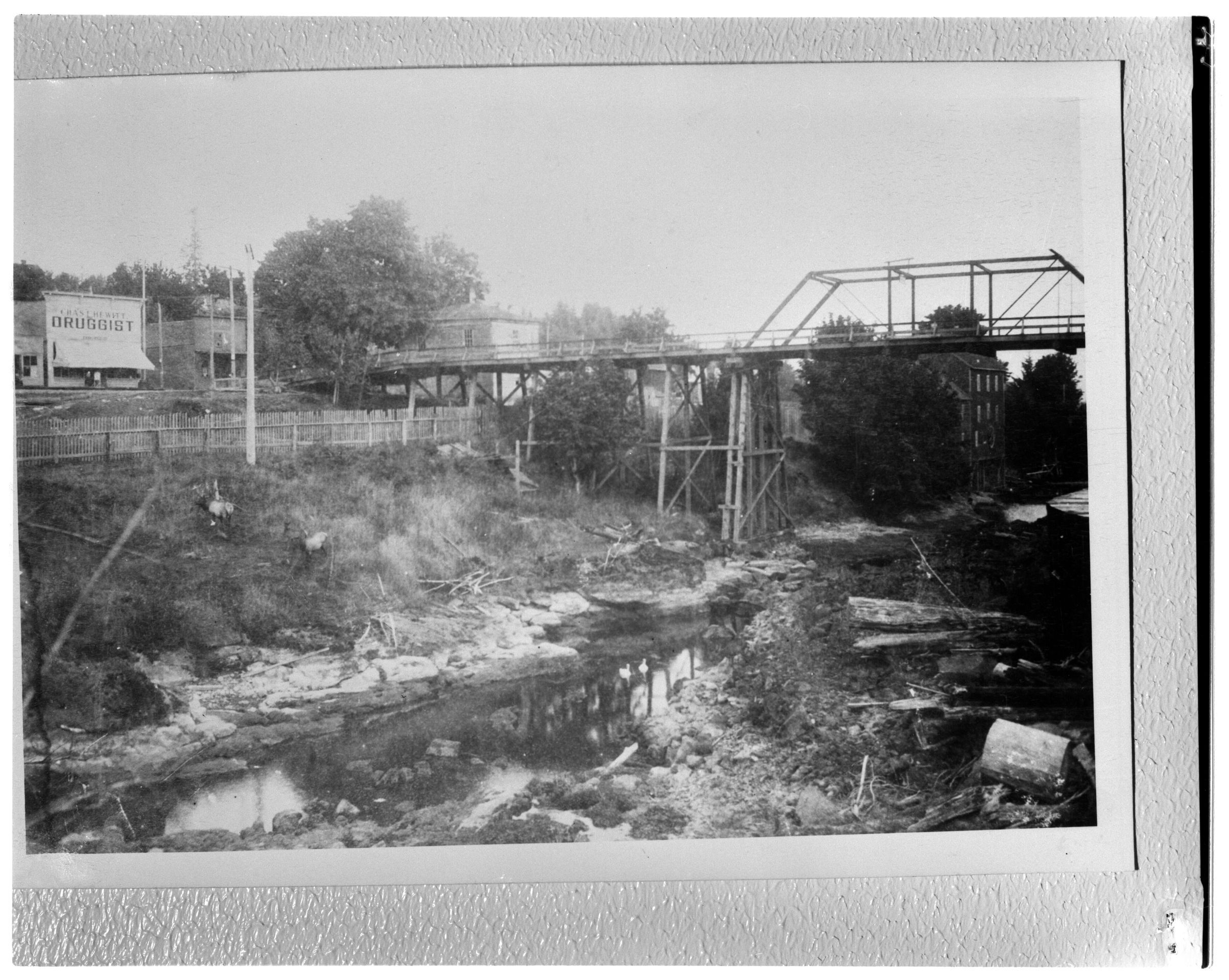 Negative, sheet film. 4 x 5 b&w. The wooden Boston Street Bridge crosses the Deschutes River; at the west end of the bridge is "downtown" Tumwater including a drugstore, bicycle shop, and other wooden buildings. View looking north-northwest.Name/Title