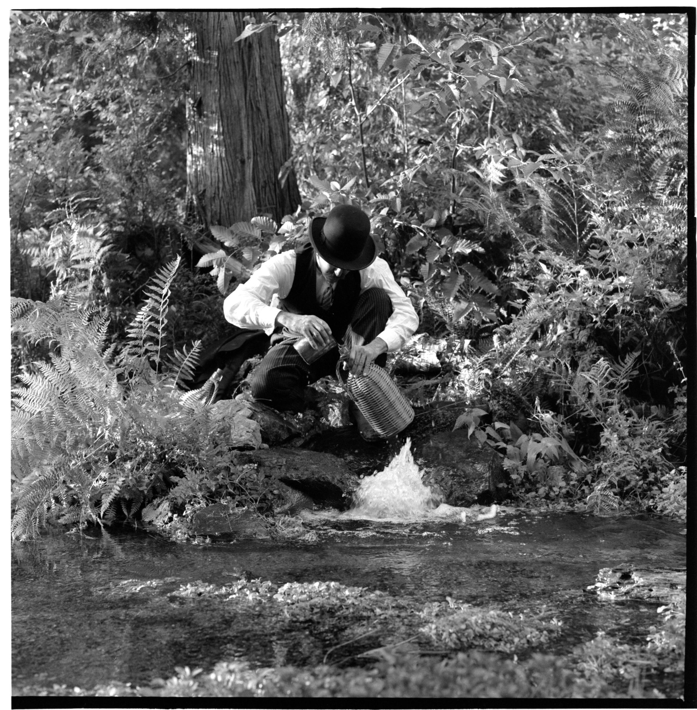 Negative, sheet film. 2.25 x 2.25 b&w. Making of TV commercial for Olympia brewery; actor appears as Leopold Schmidt sampling water from artesian spring.