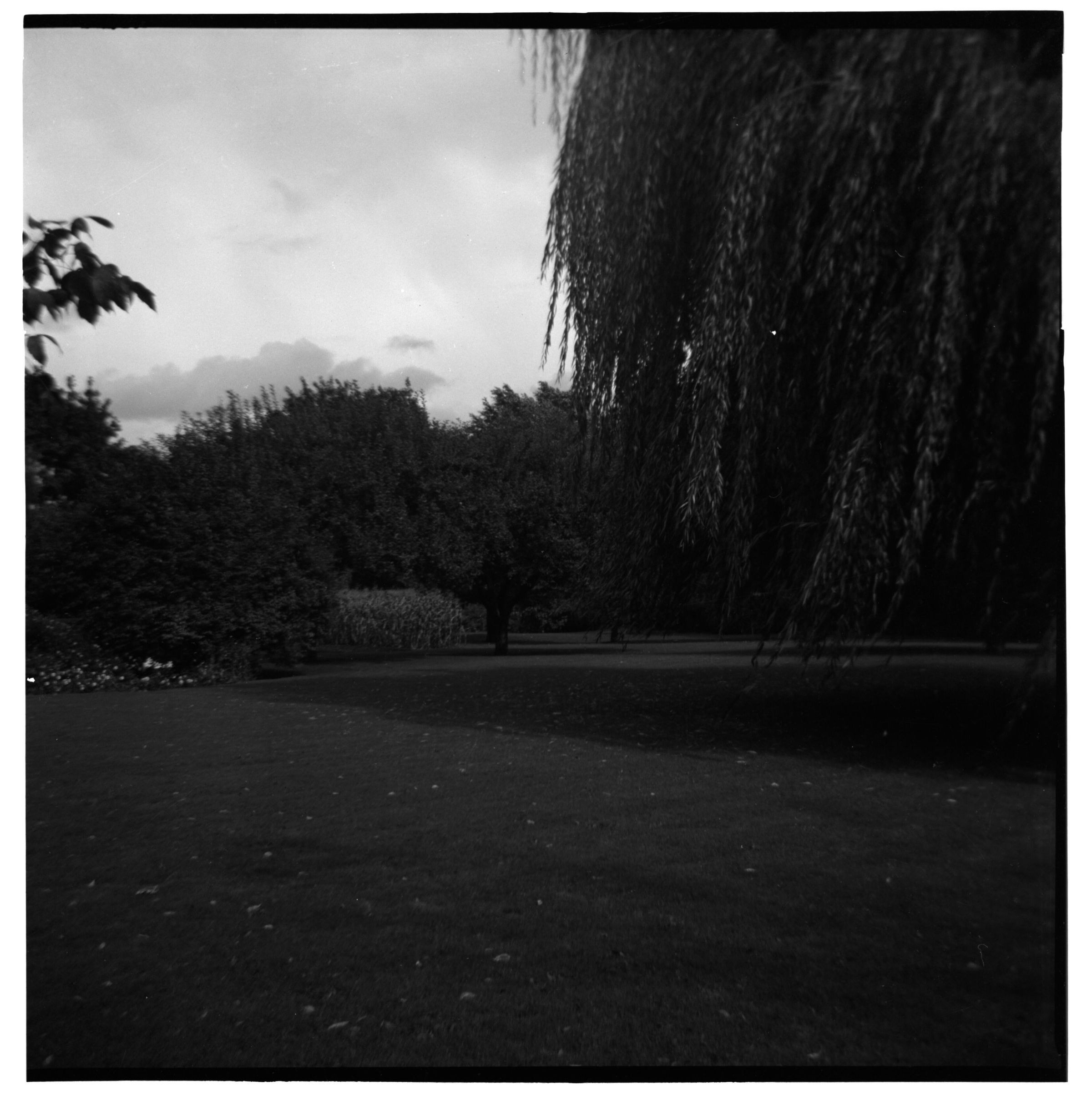 Negative, sheet film. 2.25 x 2.25 b&w. Schmidt House yard, parking area, tennis court.
