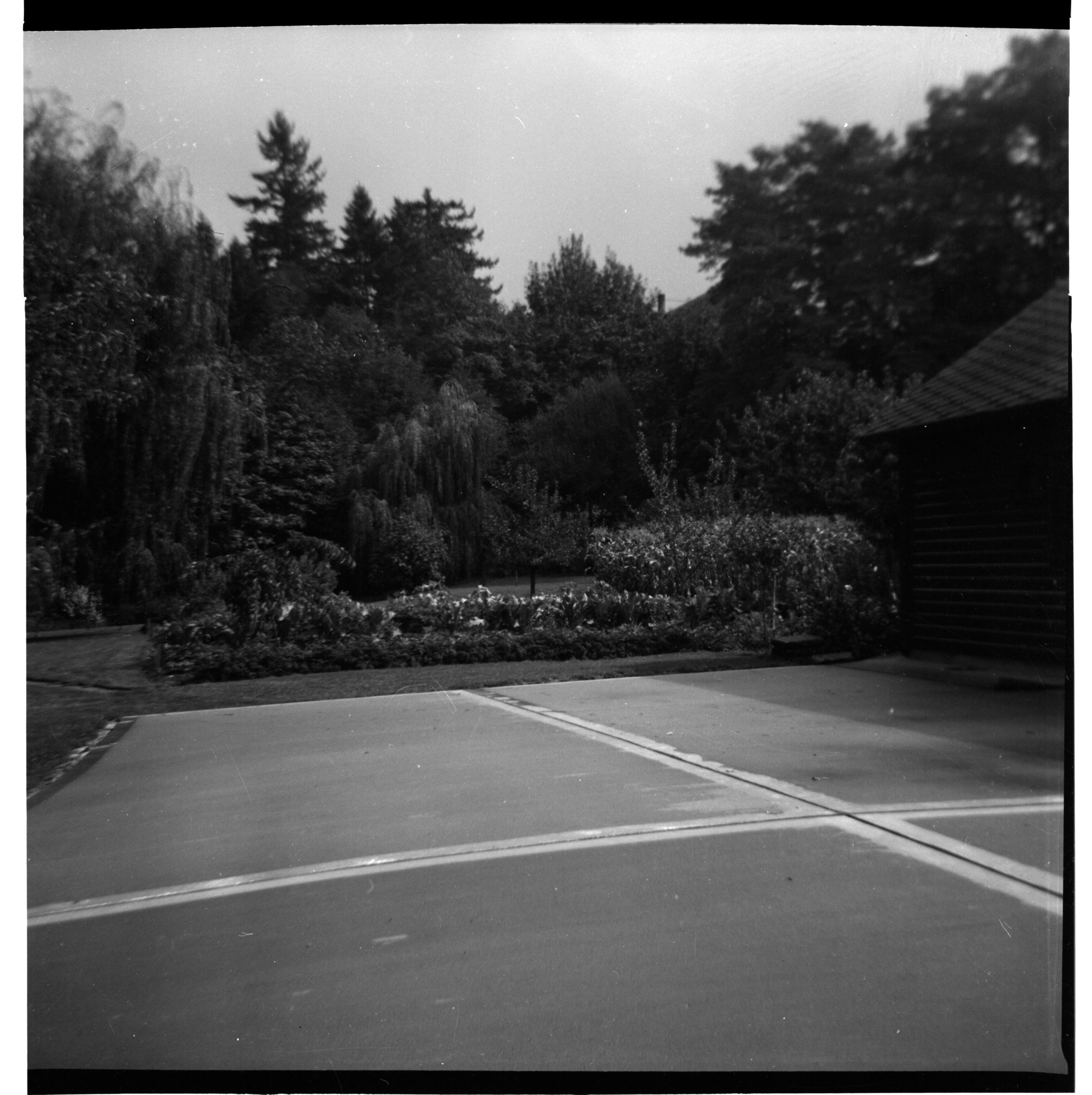 Negative, sheet film. 2.25 x 2.25 b&w. Schmidt House yard, parking area.
