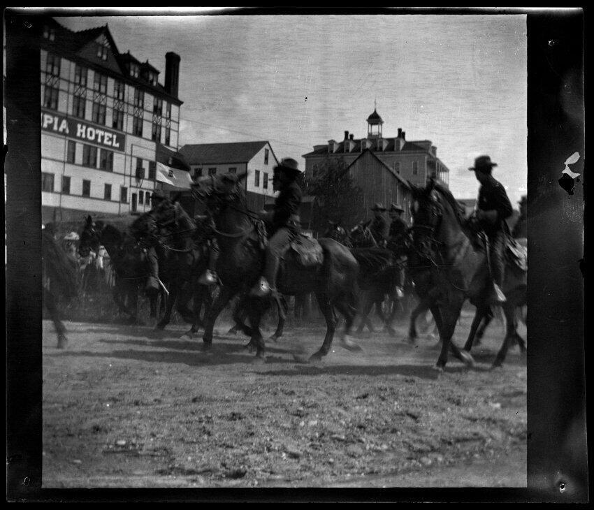Negative, sheet film. 4 x 4 b&w. Parade near Hotel Olympia.